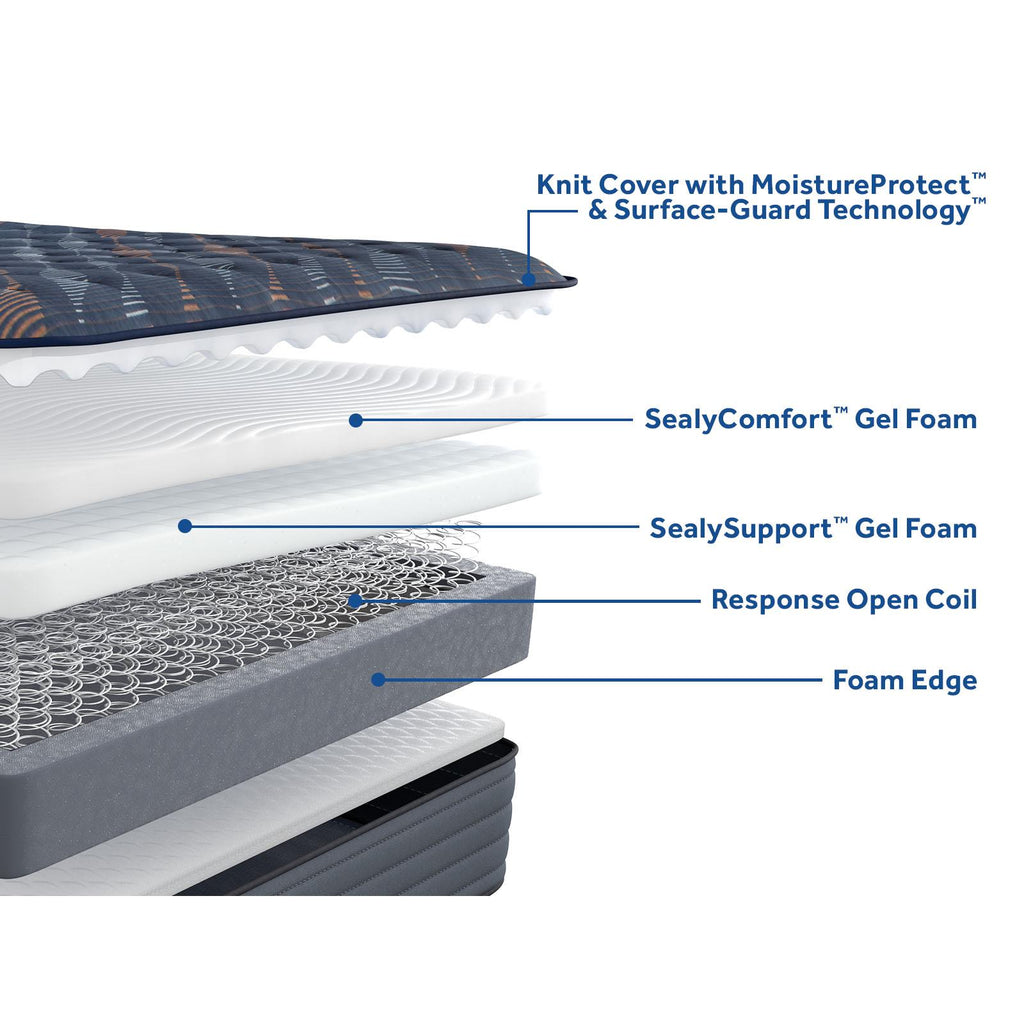 • Firm, supportive comfort: Layers of Sealy® gel foams combine with precisely engineered open coils to deliver flexible, breathable, personalized comfort with conforming support and a firm feel.